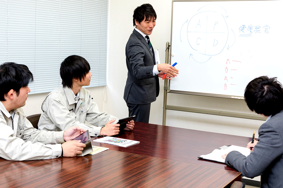 入社から1ヶ月間、社会人としての基礎的なマナーを身に付けた後は、先輩社員に同行しながら現場で仕事を学んでいきます。早い段階から現場の空気を肌で感じ、仕事を覚えることができるため、「即戦力として活躍したい」という上昇志向のある方にはピッタリ!