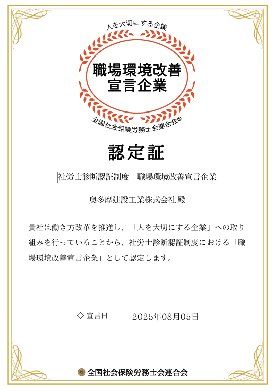 2025.08.06 「職場環境改善宣言」更新しました 全国社会保険労務士会連合会より 今年も「職場環境改善宣言企業」として 認定証をいただきました。 目指すは「人を大切にする企業」。 今後も社員の働き方改革に取り組んでまいります!